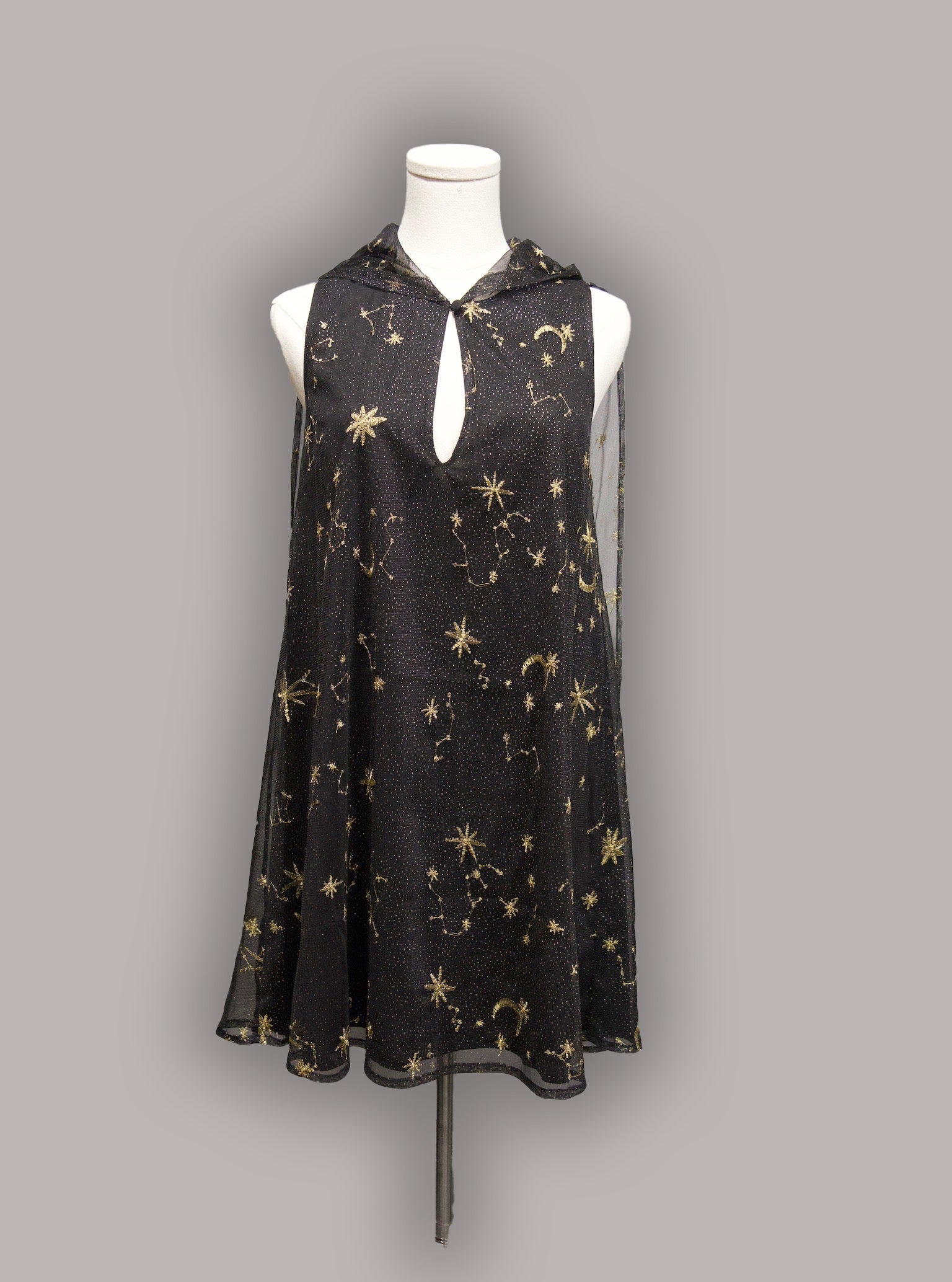 This 60s style A-line mini tent dress features embroidered celestial fabric, a sheer attached capelet and hood, plus a keyhole closure at the neckline.