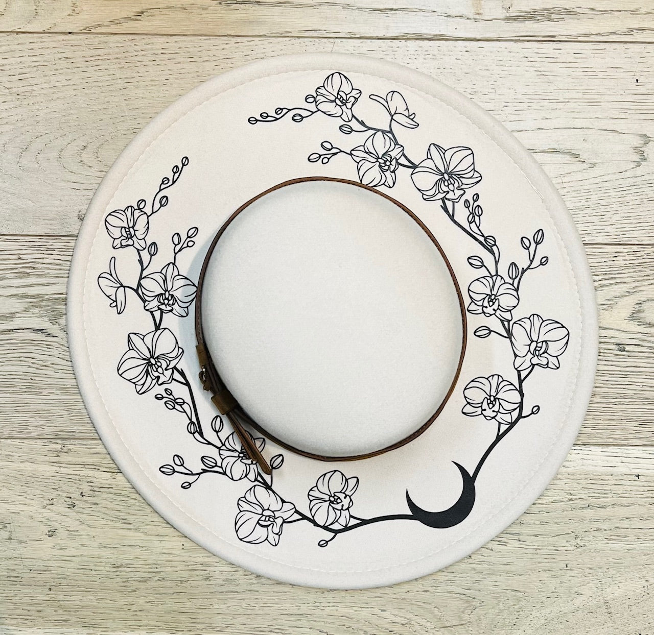 Vegan Felt Wide Brim Hat - Flat Top - Cream - Orchids Outline