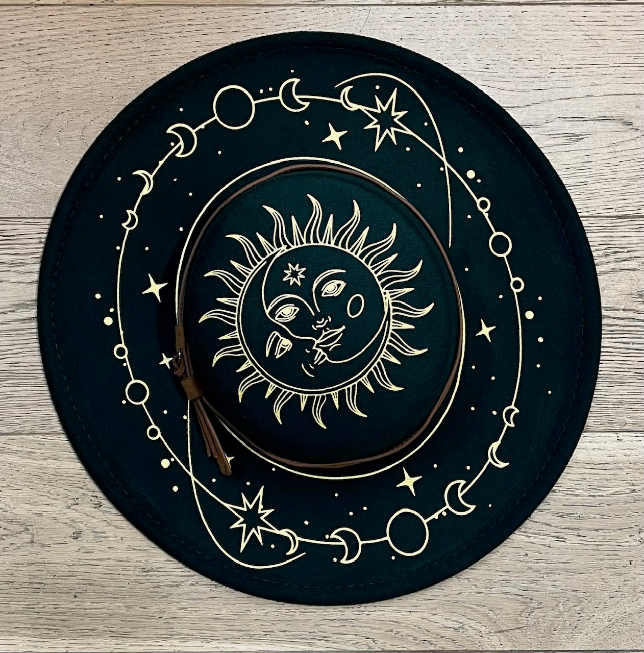 Vegan Felt Wide Brim Hat - Flat Top - Emerald - Celestial Sun/Moon