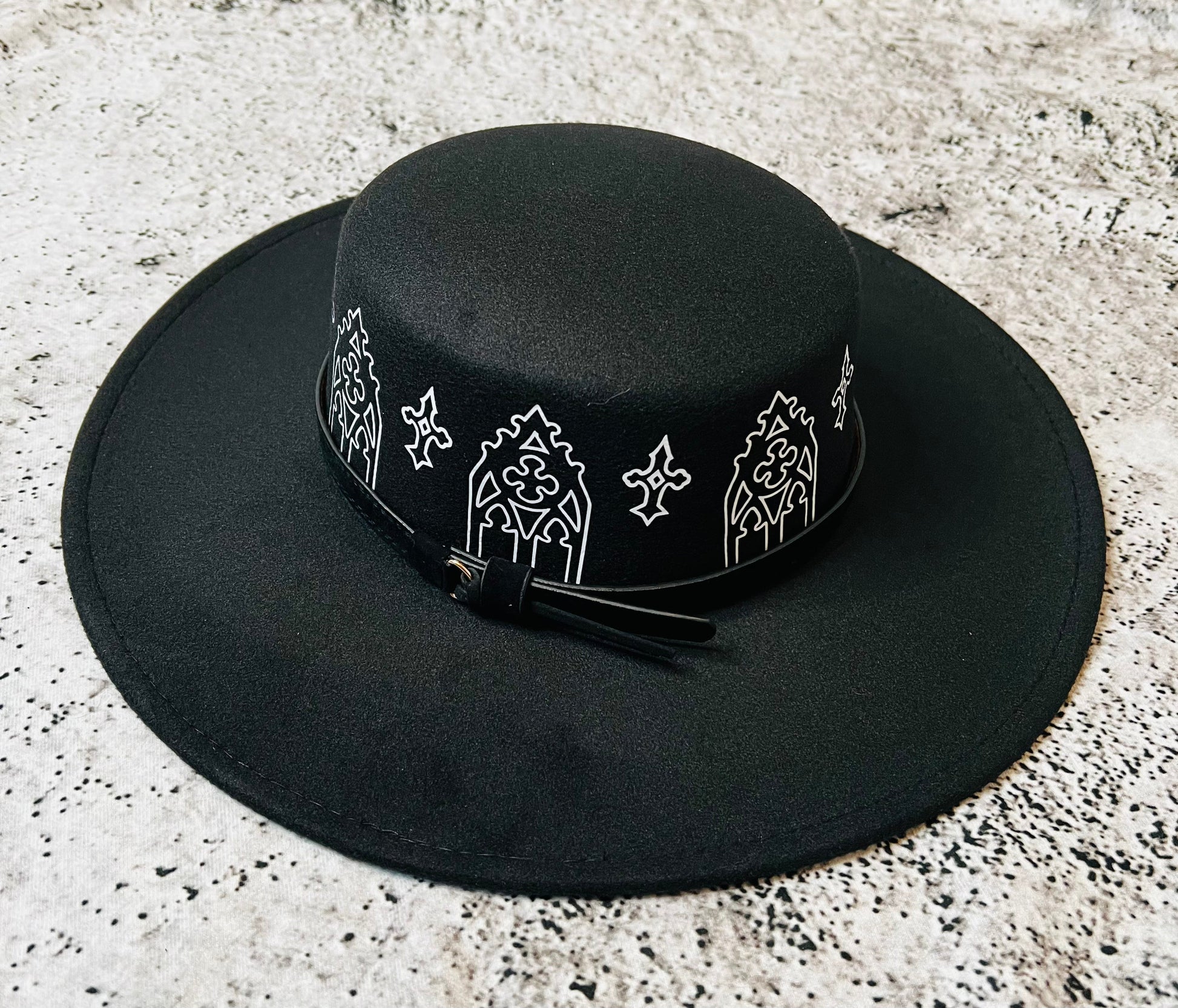 Vegan Felt Wide Brim Hat - Flat Top XL Brim - "Rot Iron Arches"