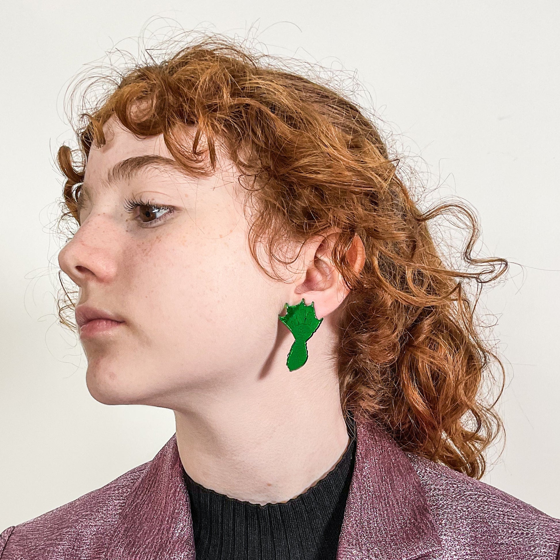 Mirror green plastic was an obvious choice for these Swamp Monster Hand Earrings. Shiny and shimmery; it looks like these fishy-fingers are underwater.