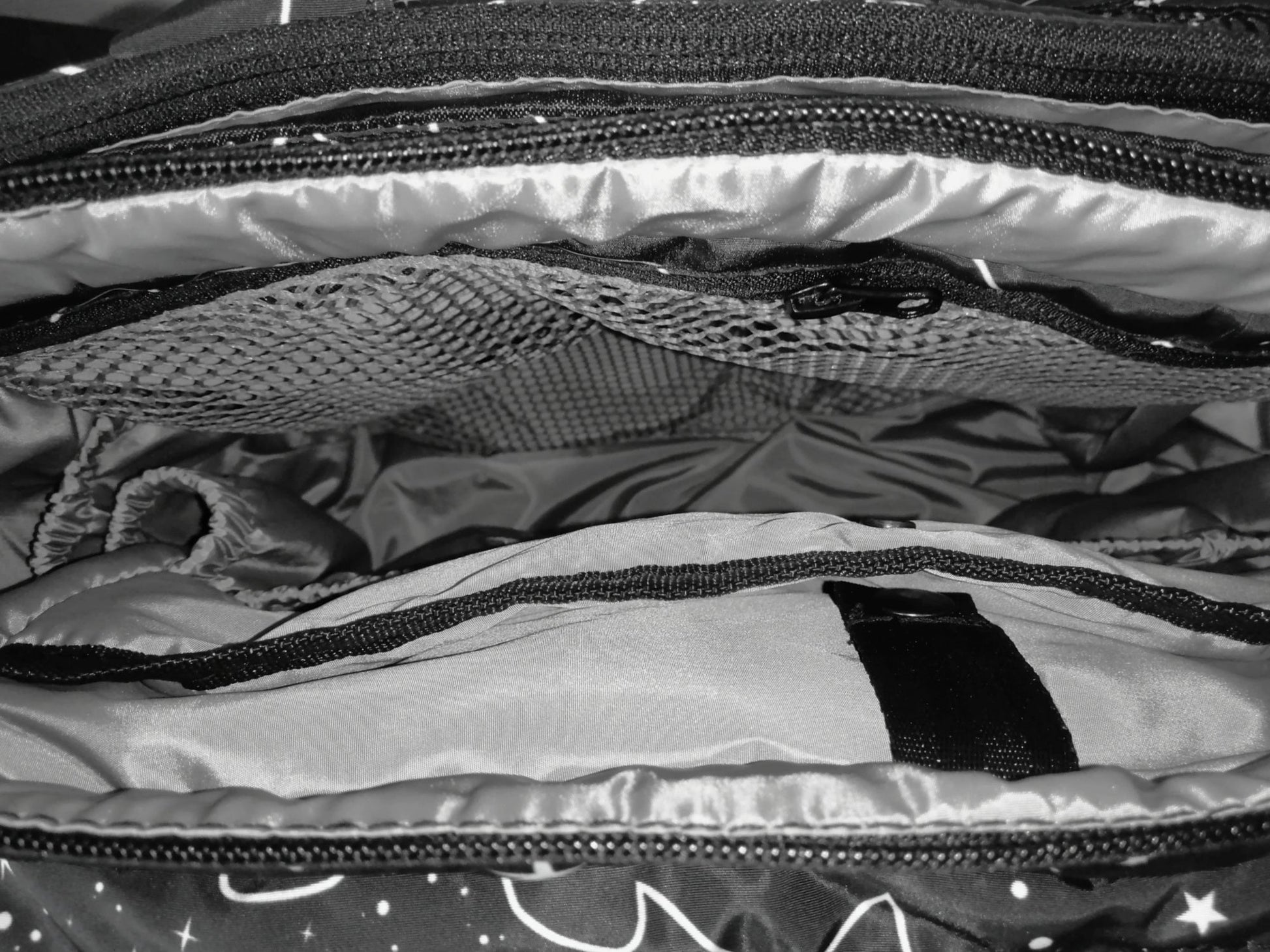 - 1 back snapped pocket (can be unzipped from the bottom to slide over your suitcase handle)