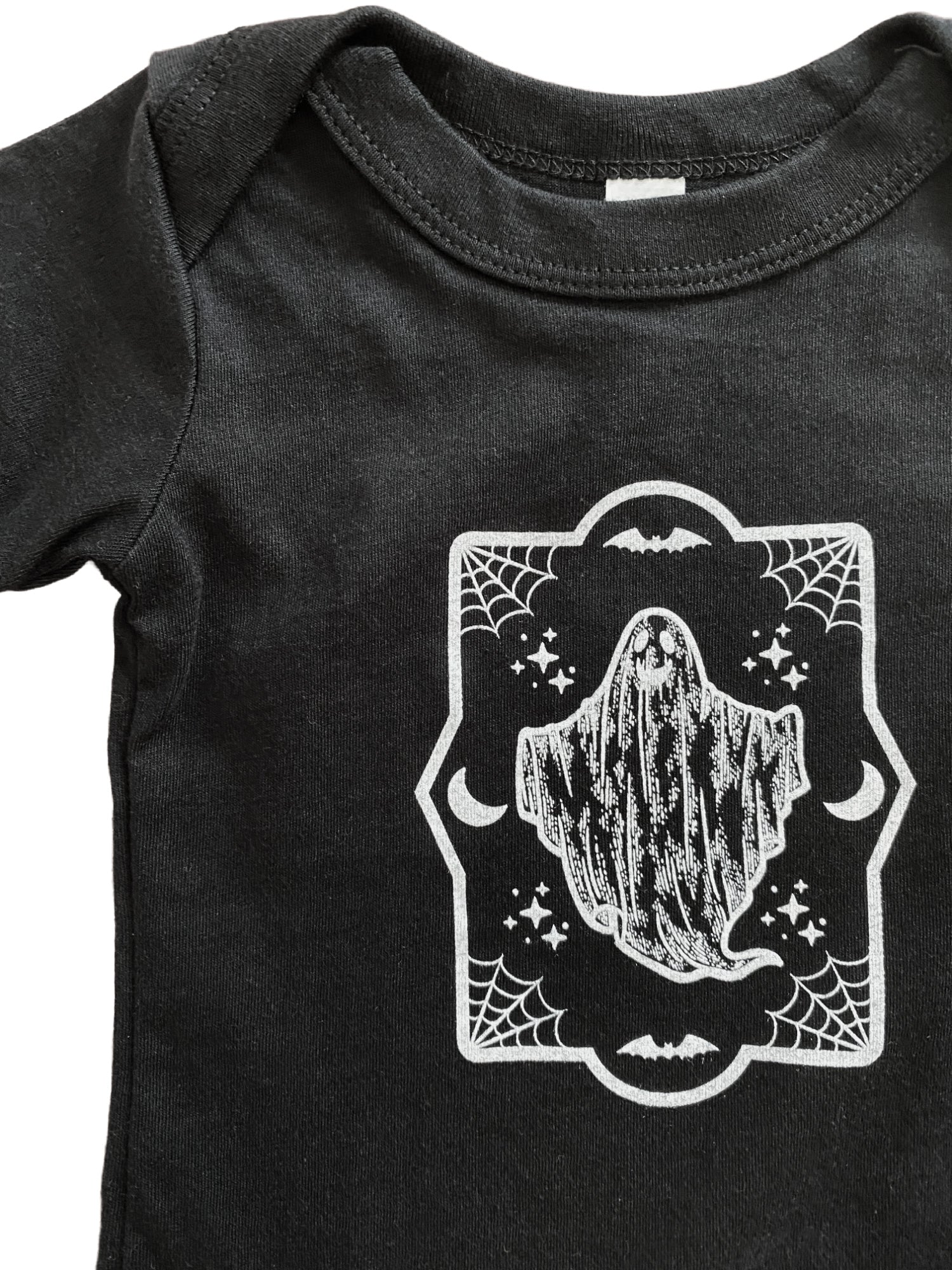 Ghosts are our favorite motif...and we thought: why not make a lovely cameo style design for the WHOLE family!? Also available in toddler/kids and adult tees. There is one large graphic on the front only in white ink on a black tee. This garment is 100% ringspun cotton and has good stretch.