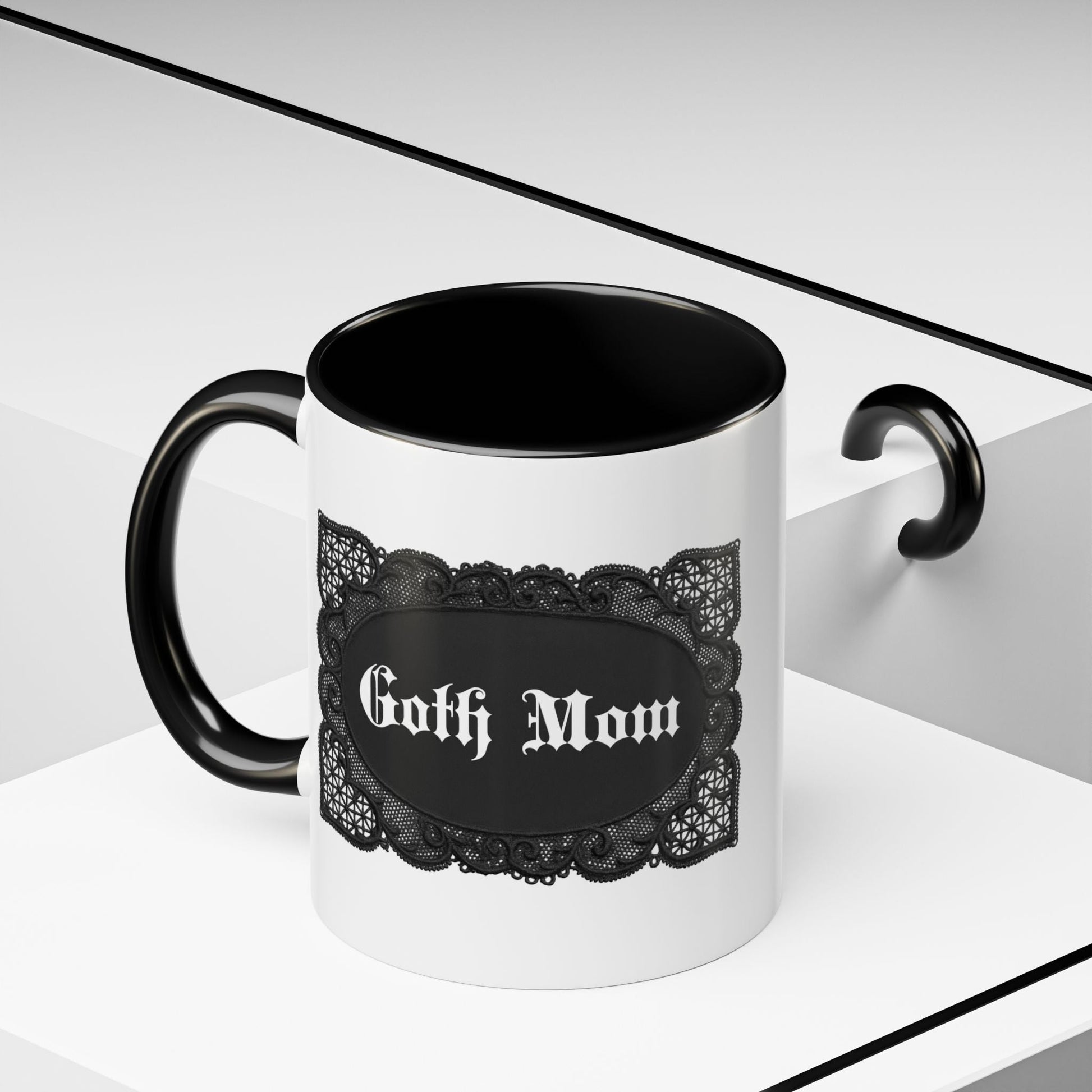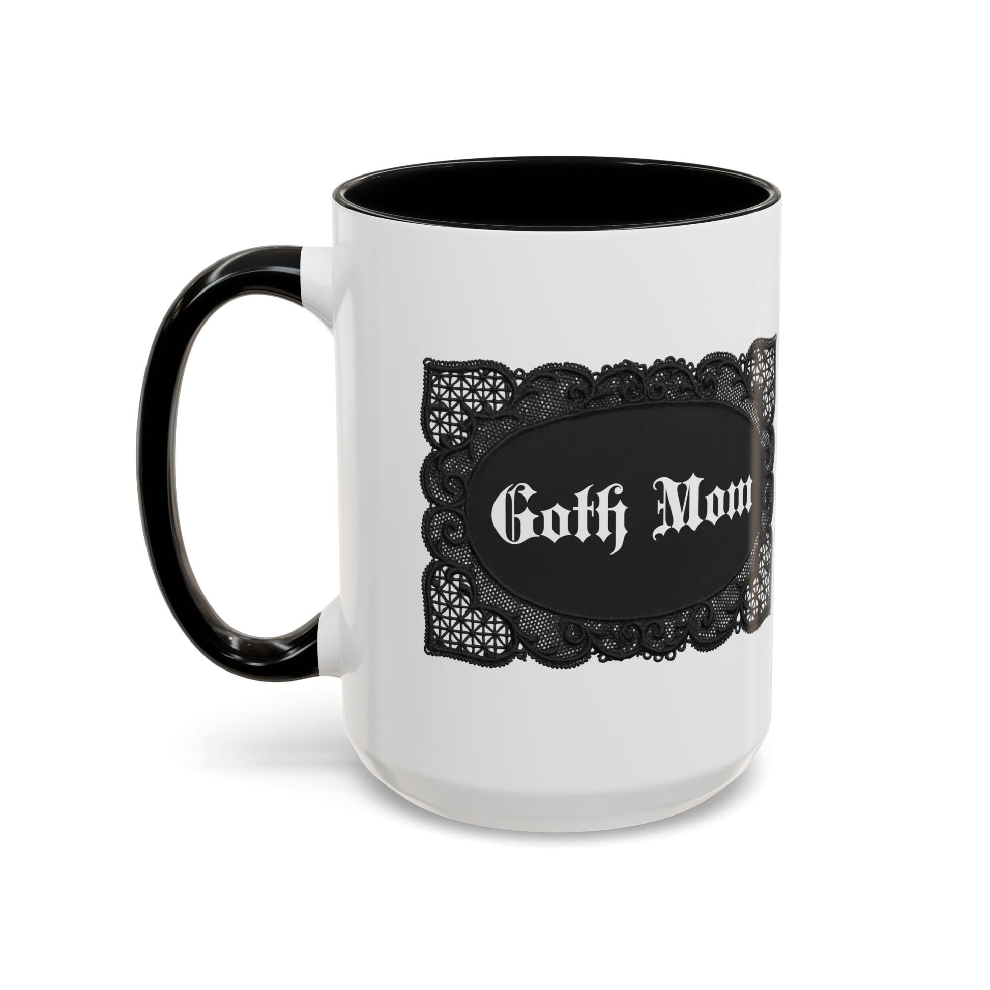 Goth moms know that a mug is an essential...and this one is SO unique and lovely. This mug brings the perfect blend of style and functionality to elevate your coffee or tea ritual. Available in two generous sizes, 11oz (0.33 l) and 15oz (0.44 l), this mug offers ample space for your favorite brew. Made with white ceramic and sporting a sleek glossy finish with eye-catching black contrast, this mug is a bliss both to use and to look at. The ergonomic C-shaped handle provides a comfortable grip, while the lead and BPA-free construction guarantee peace of mind with every sip.