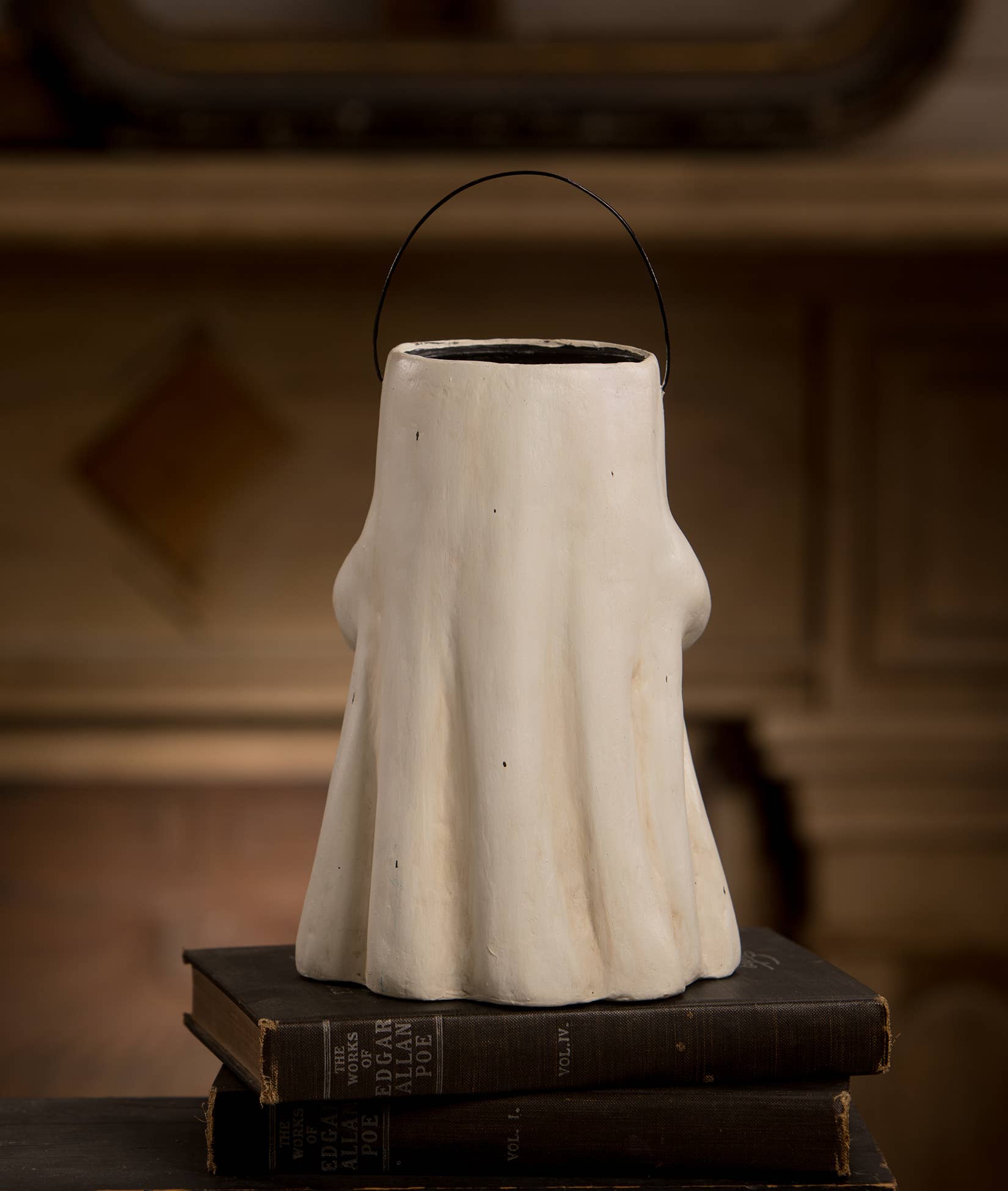 Even ghosts like to trick-or-treat at Halloween. This charming paper mâché ghost is hollow on the inside to hold candy, Halloween floral, or anything else! Bring the magic of Halloween to life in your home with specialty holiday décor by Bethany Lowe Designs. This piece is carefully antiqued and distressed by hand to give it a unique, vintage look. Each one is truly one of a kind, with slight variations that add to its charm and character.
