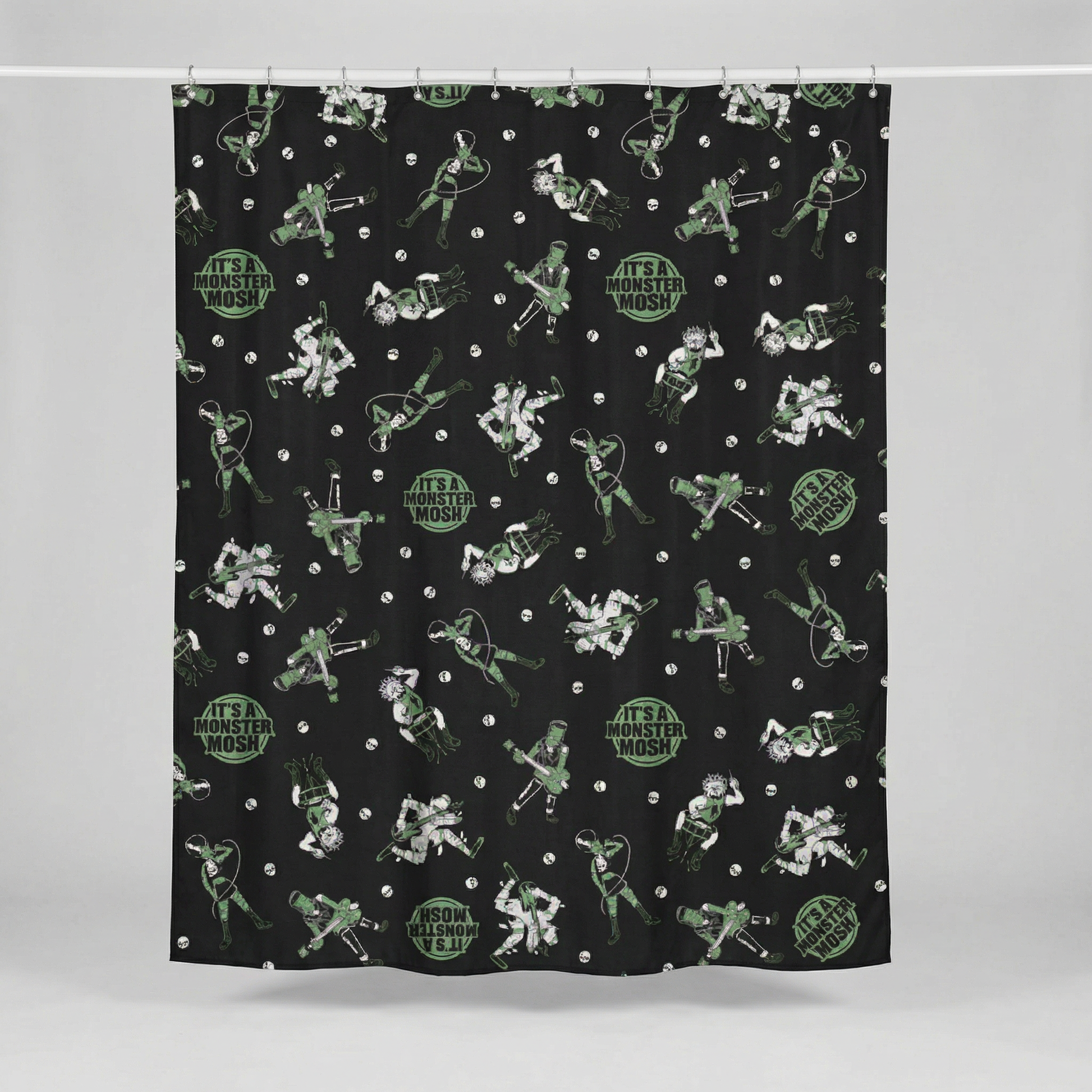 Turn your bathroom into the ultimate monster party with the Sourpuss Monster Mosh Shower Curtain. Featuring Frankenstein, Mrs. Frankenstein, The Mummy, and a Werewolf ready to rock out, this curtain adds spooky fun and retro flair to your daily routine.