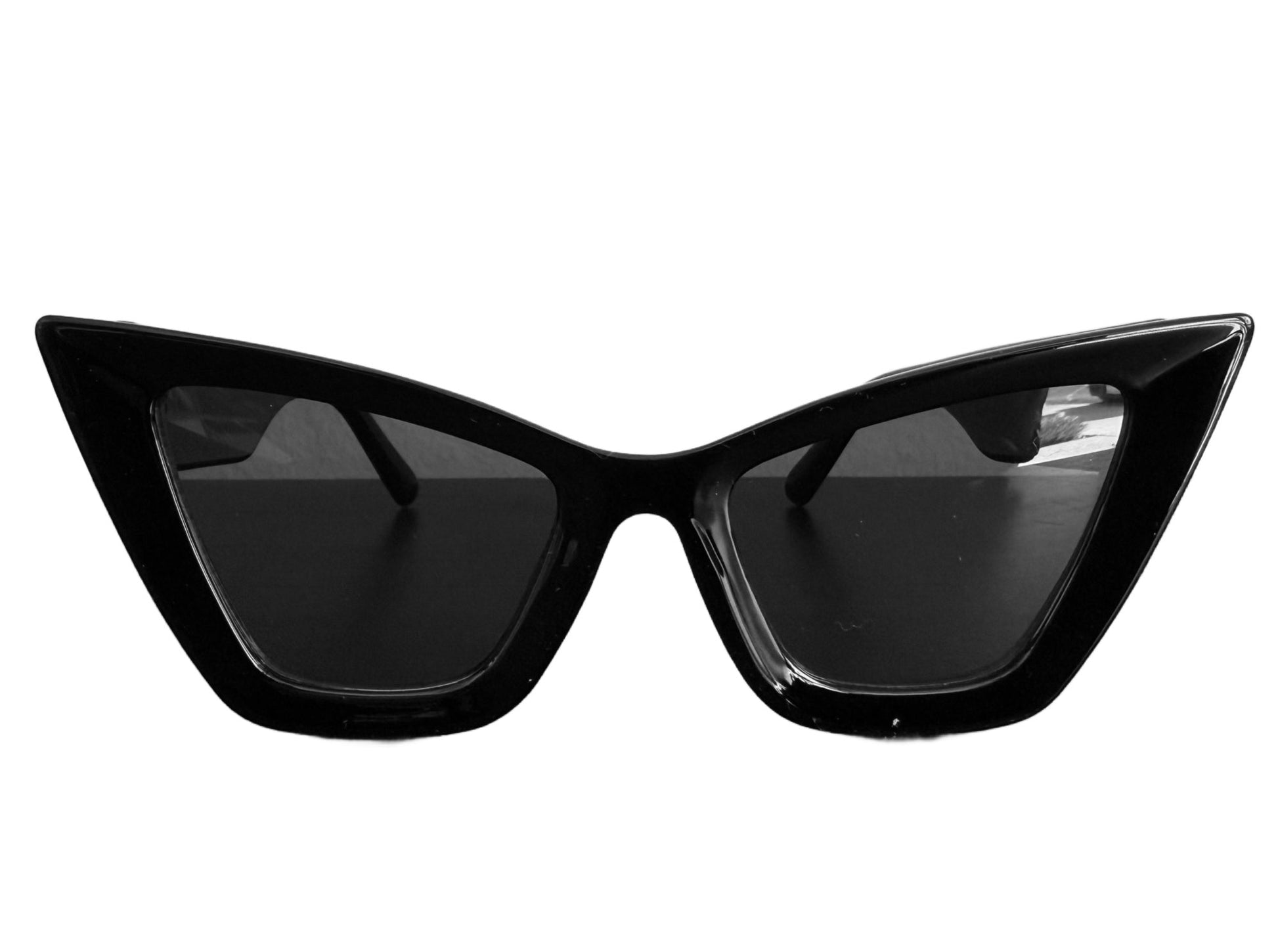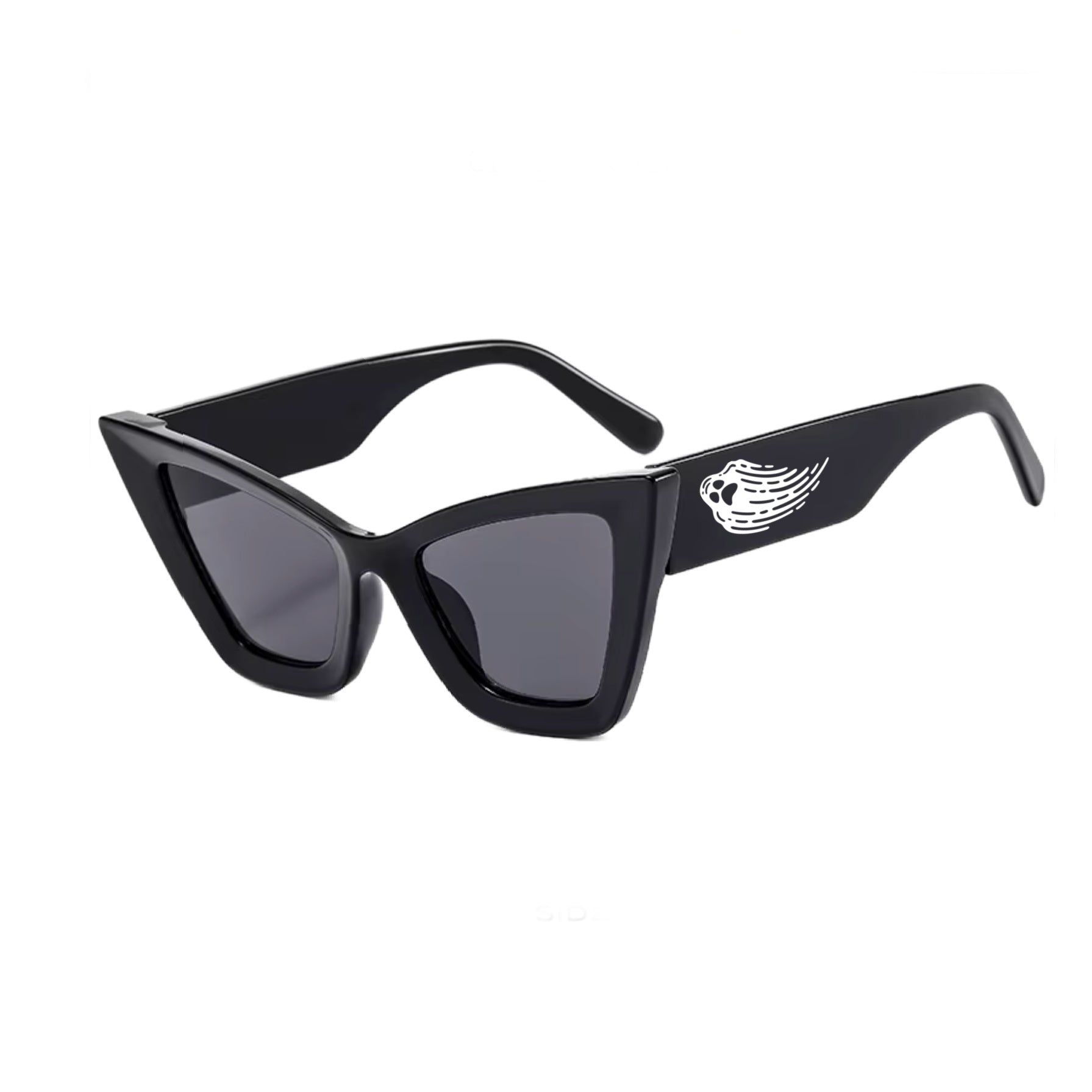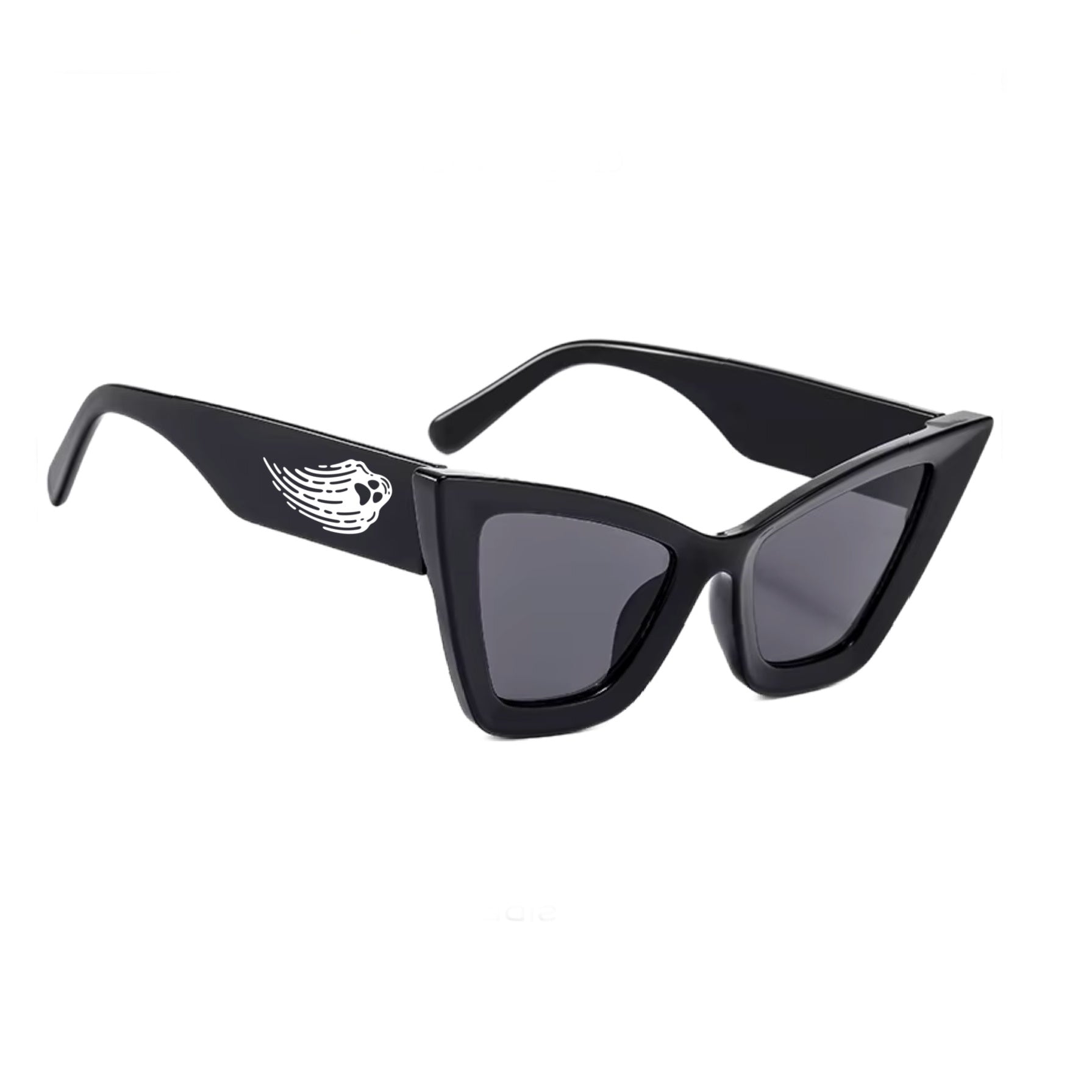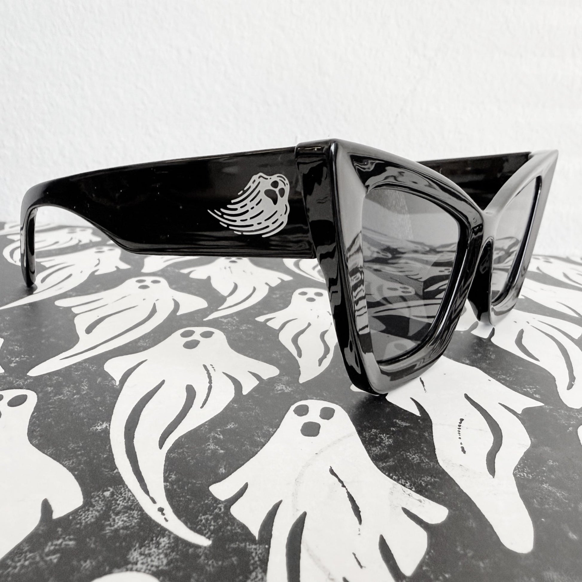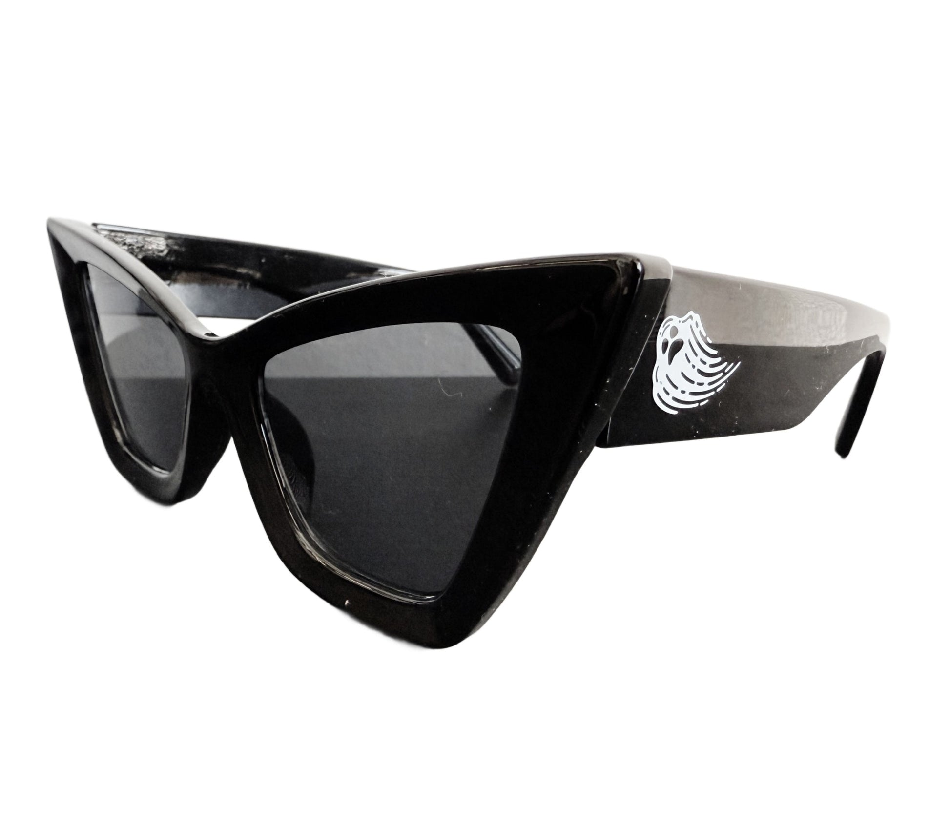 We had so many requests for a non-mom version of the Goth Mom Sunglasses...and here is our answer! The Spirited sunglasses features a white, haunting ghost icon on either leg of the sunglasses. The shape of these sunglasses is a pure classic, but also cool and edgy. The perfect black cat eye with black lenses! Slightly oversized and dramatic, just like we like! UV lens protection.