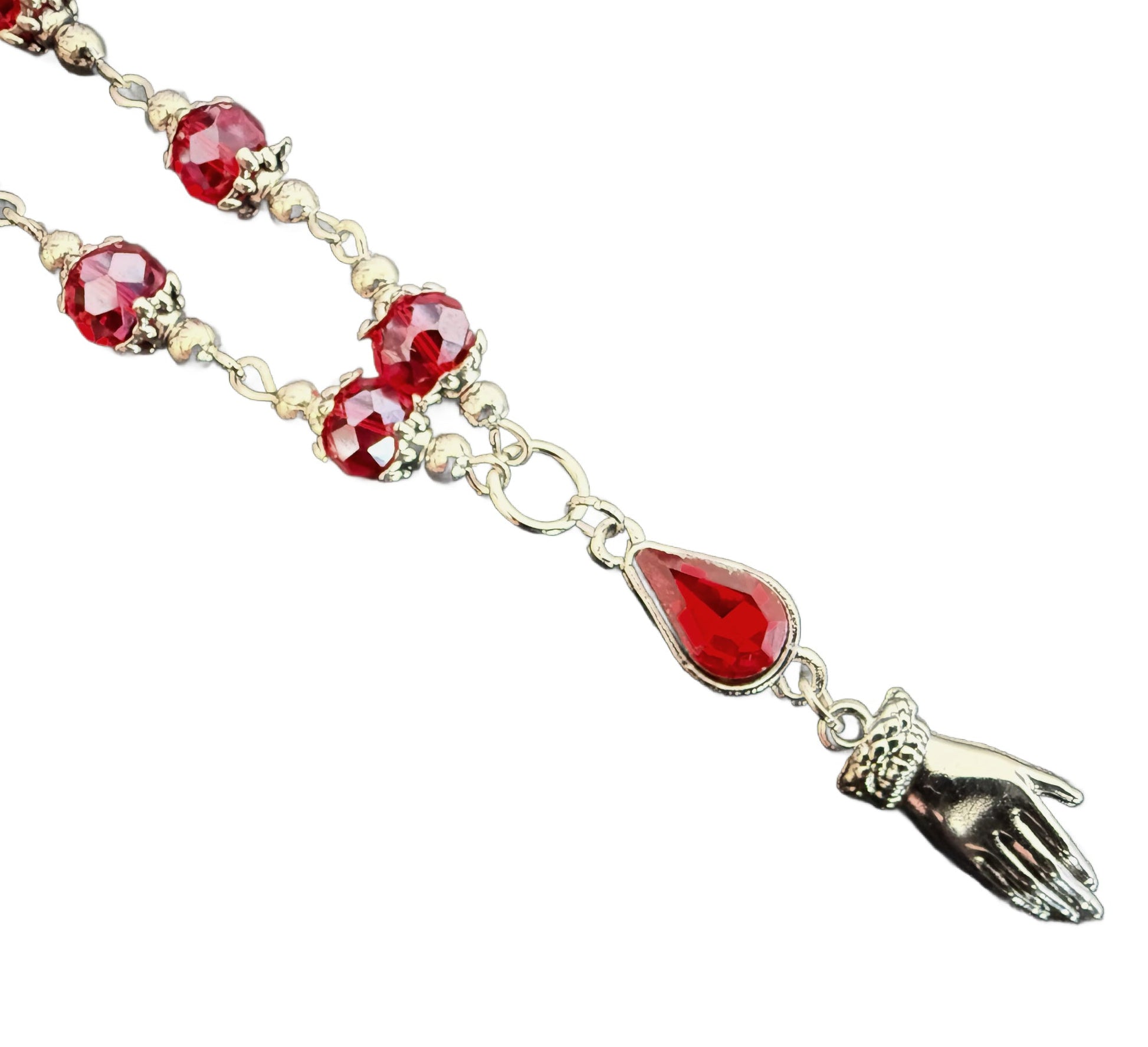 This necklace features silver-toned hardware mixed with red, iridescent beads. The pendant is a tear shaped connector with a red gem center and a silver-toned Victorian-style hand dangling. The chain is 19" around the neck (complete with closure). If you'd like a different length, we can customize it, just please let us know and give us an extra day or two! Each necklace ships in a black paper jewelry box or black velvet bag.