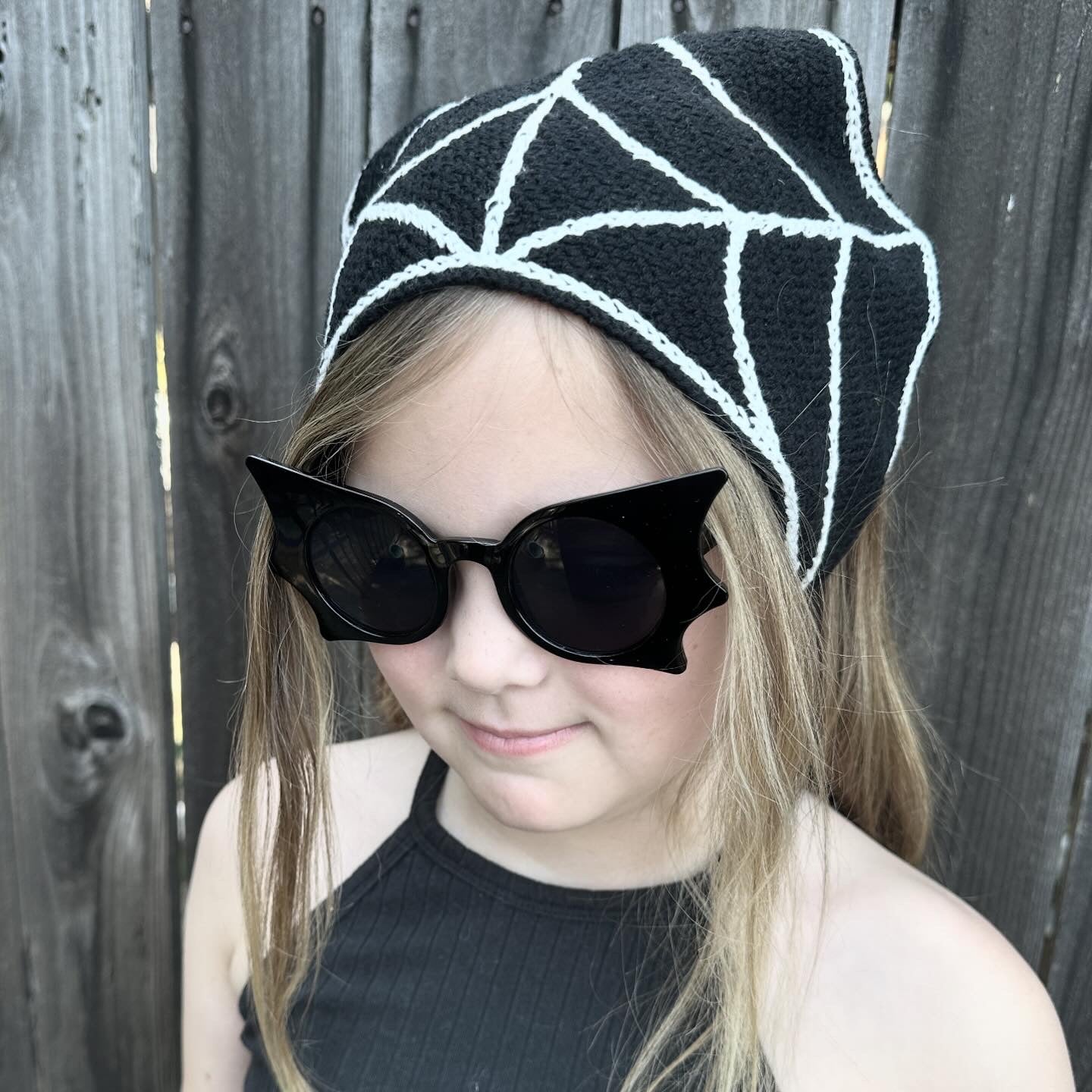 These sassy kids sunglasses are just what your cool kid needs this summer. They feature an exaggerated cat eye shape but out of bat wings. The lenses are also dark black (and UV protected). Best for ages 3-8 years. Zara is 8 years old and wearing the sunglasses in the photos.