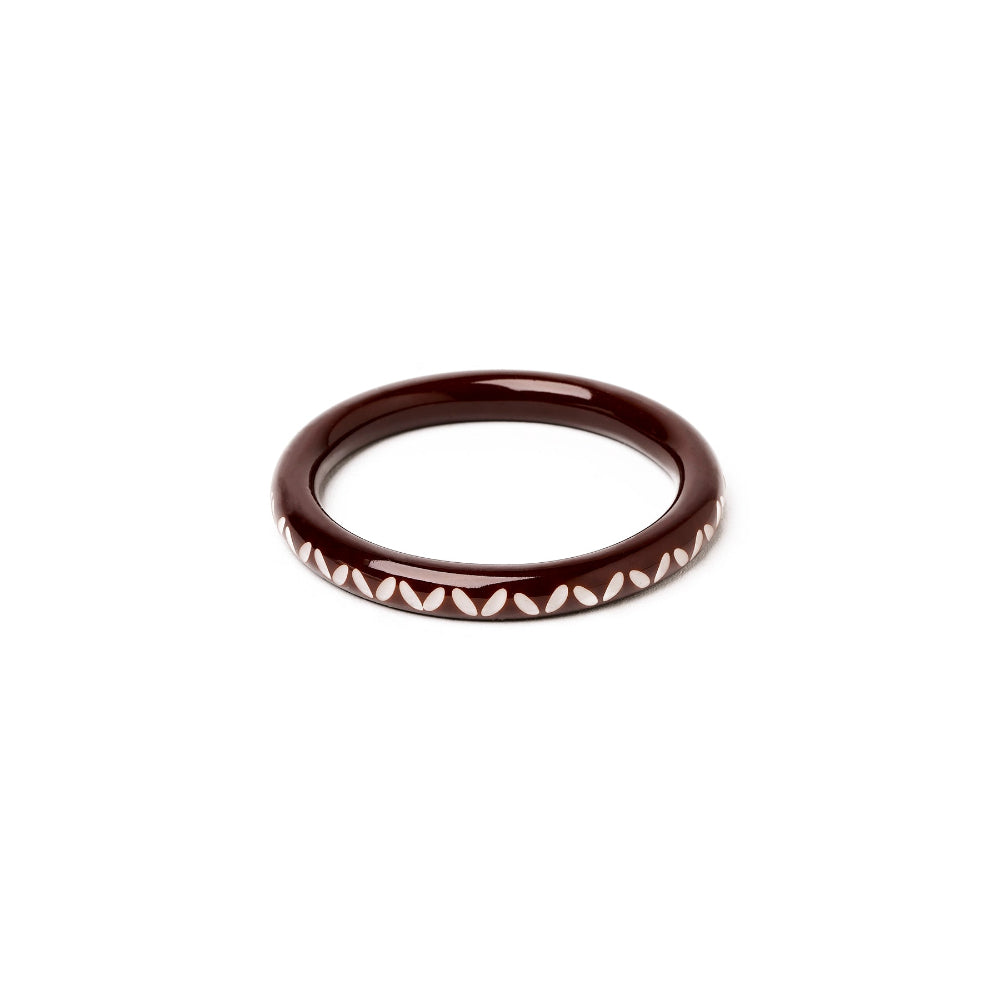 Slim and packed with detail, the Narrow Saddle Brown Bangle features alternating seed shaped carvings in a wreath-like pattern. It’s a subtle nod to stitched leatherwork and floral Western trims; ideal for building texture into your stack.