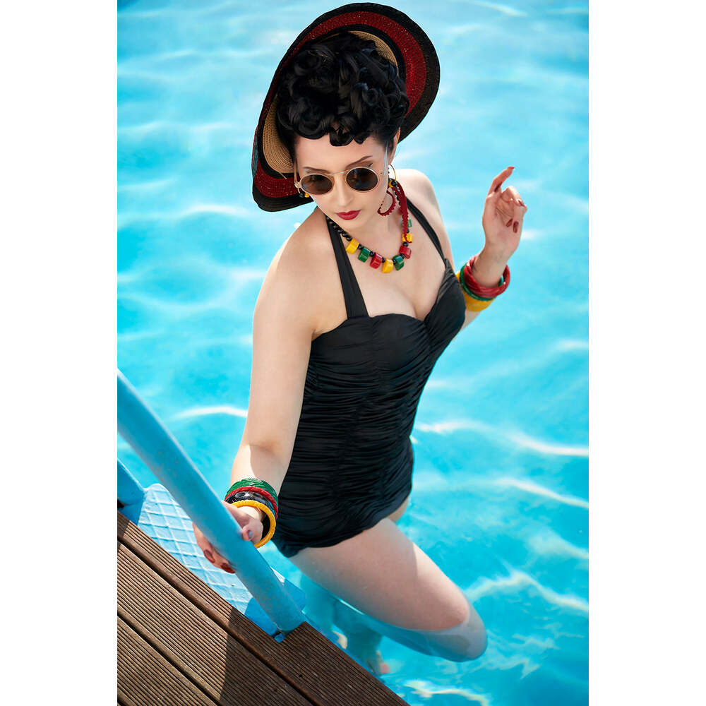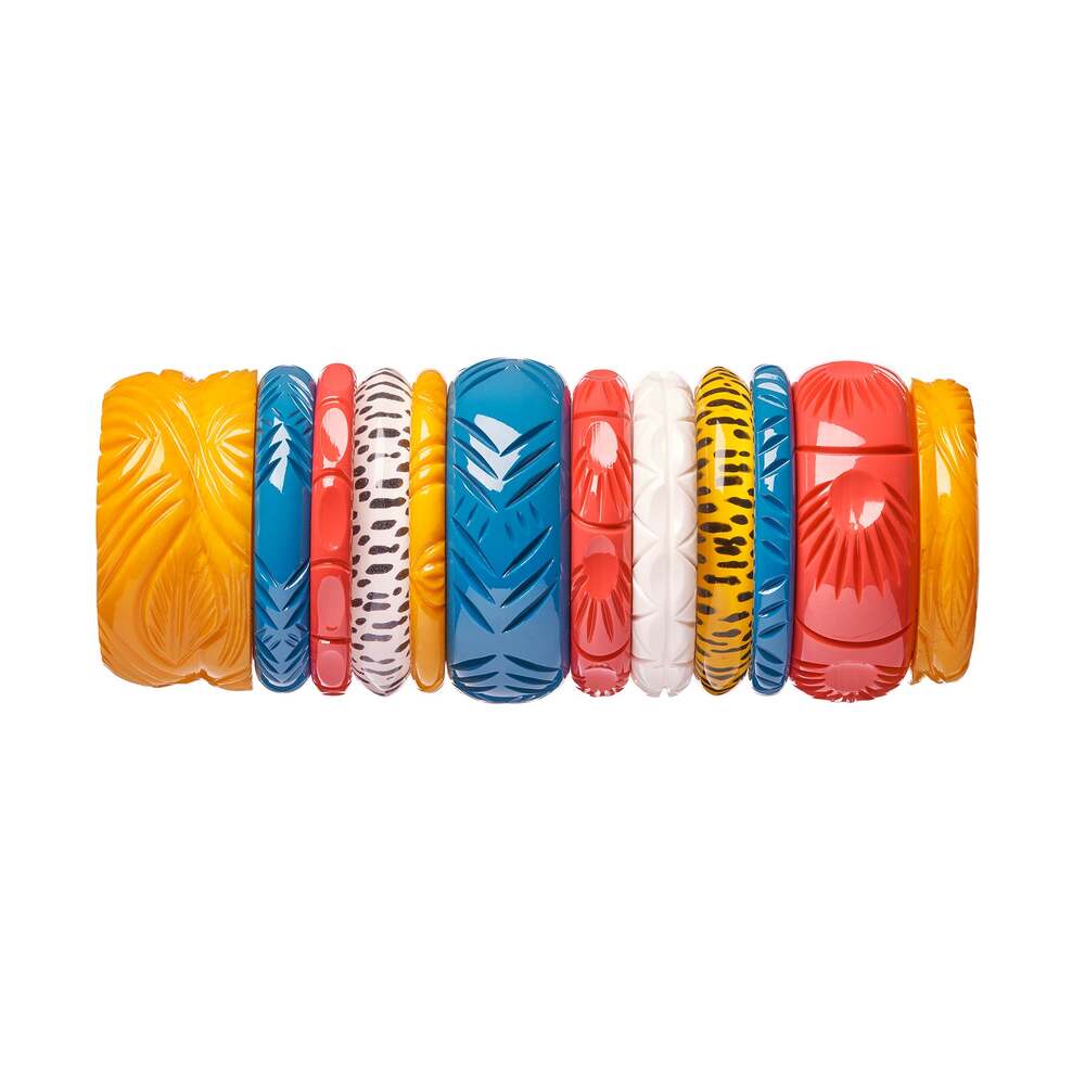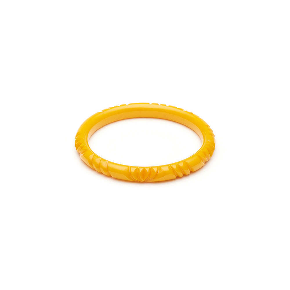 The bright yellow Narrow Yolk Heavy Carve Fakelite Bangle is perfect for your summer outfits, and the heavy carved fakelite design gives a real feel of true 1940s Bakelite.